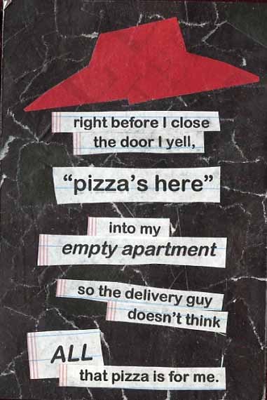 c’mon you know you have… I’ve gone one step further actually, whenever I order food & happen to be home alone….as soon as I hear the doorbell ring, I always yell out, ‘oh I got it! huh? no, no, I said I got it!‘, followed by a loud chuckle before I finally answer the door pretending I’m in the middle of some wildly enjoyable conversation and barely heard the bell. yea, as if the delivery guy really cares but it gives me a sense of safety & makes me feel like less of a pig…though in retrospect, I’m sure not too many groups of people are ordering one hot dog with fries or an individual pizza…hmmm maybe my plan has some holes in it…